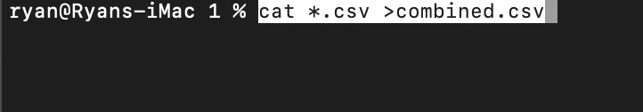 5. 그리고 cat *.csv >combined.csv (이 경우 합치는 화일명을 combined로 해준것으로 원하는 파일명을 적으면 되겠다) 를 쳐주면 끝!